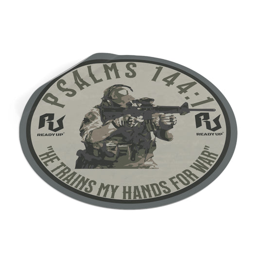 He Trains My Hands For War – Psalms 144:1 Round Vinyl Sticker