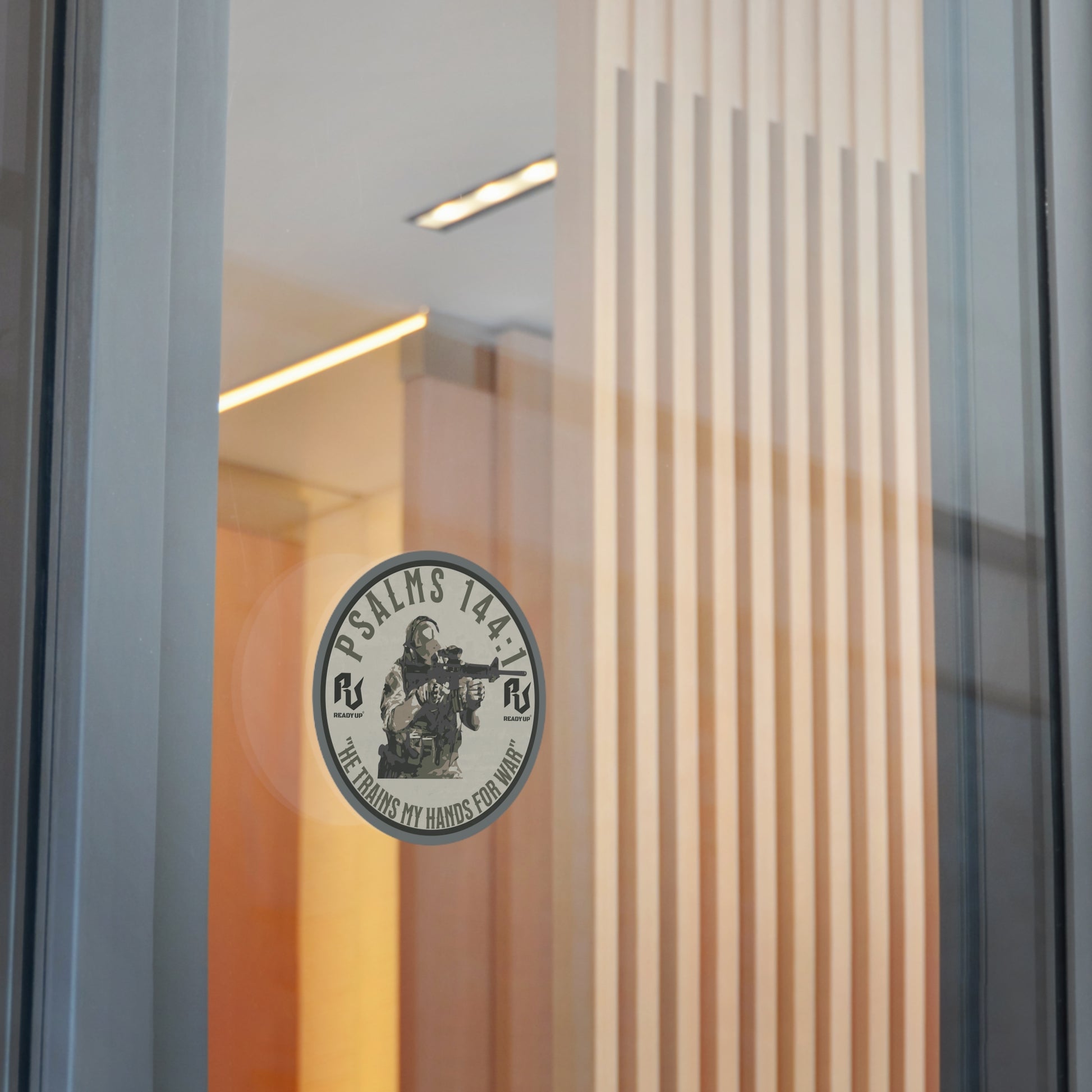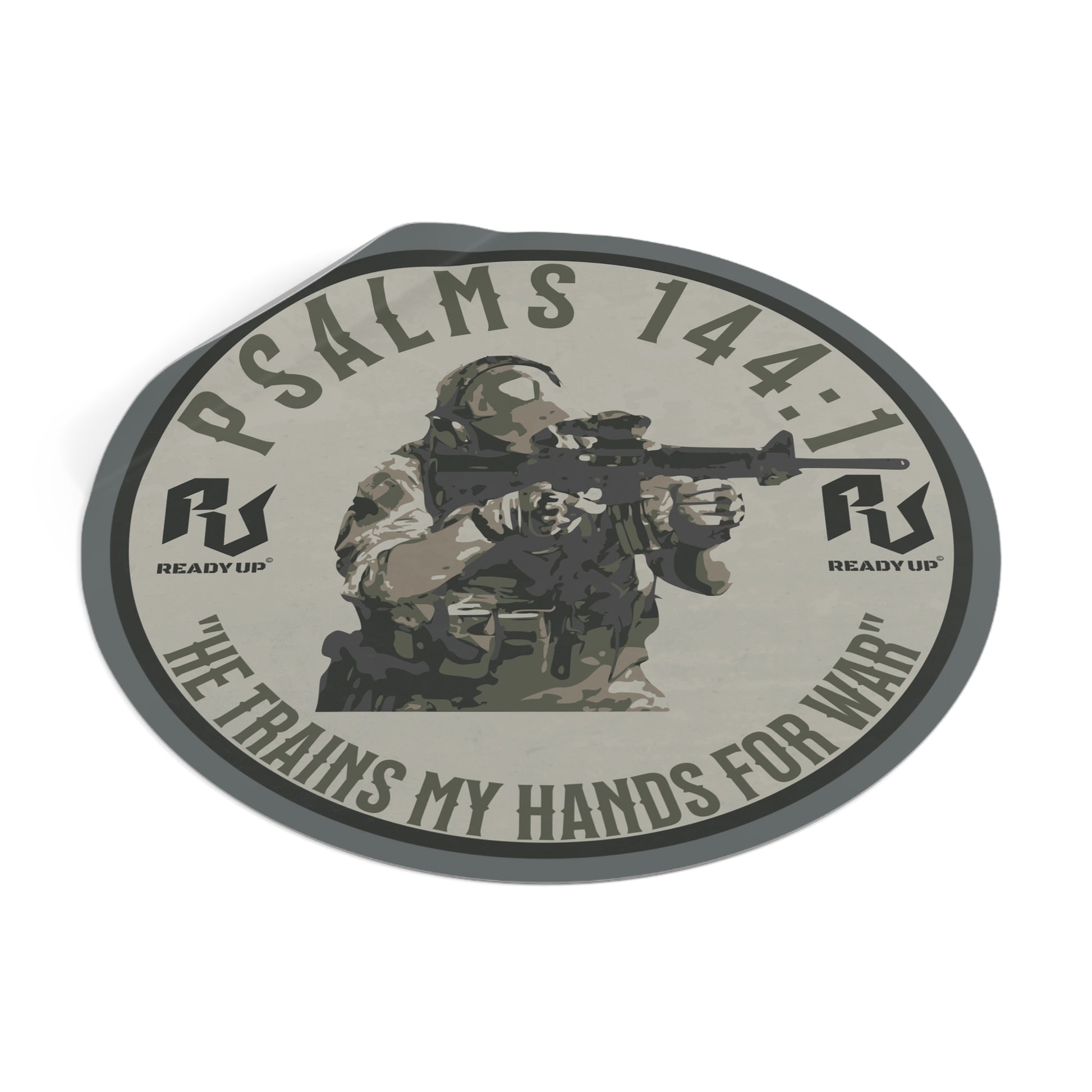 He Trains My Hands For War – Psalms 144:1 Round Vinyl Sticker