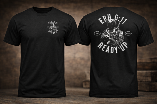 The phrase “Ready Up” isn’t branding language — it’s a posture. It reflects the command of Ephesians 6:11 to put on the full armor of God and stand firm. It represents spiritual vigilance, moral courage, and the refusal to drift through life without purpose.